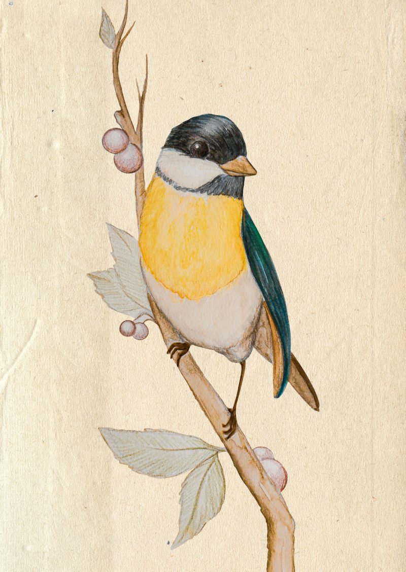 Sinica v toplih tonih je naslikana v tehniki akvarela, ozadju pa je tekstura postaranega papirja. Za popestritev otroških sob ali ljubitelje ptic, ta reprodukcija bo v prostor vnesla toplino in spomin na slikanice iz otroštva.